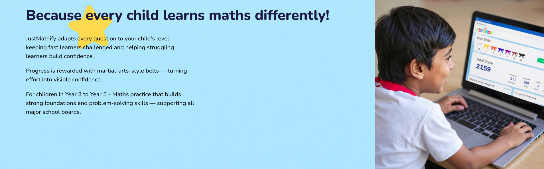 JustMathify adapts every question to your child's level — keeping fast learners challenged and helping struggling learners build confidence.